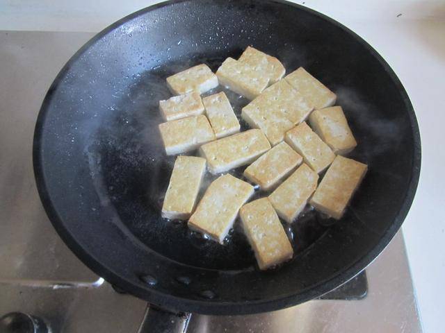制作过程:1. 烧热锅放入少许油, 将切好的豆腐块放进锅中去煎,一面煎至微微发黄后翻面将另一面也煎至微微放黄后盛出来备用;