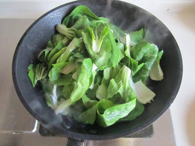 3.将洗净的小白菜放进锅中翻炒至微微变色;