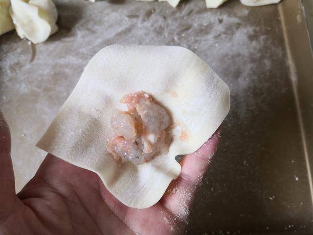 2. 将少许虾仁馅料放在馄饨皮底部,将馄饨皮向上折叠两下,再将它们折叠按压紧, 这样”虾仁馄饨“就制作好了;