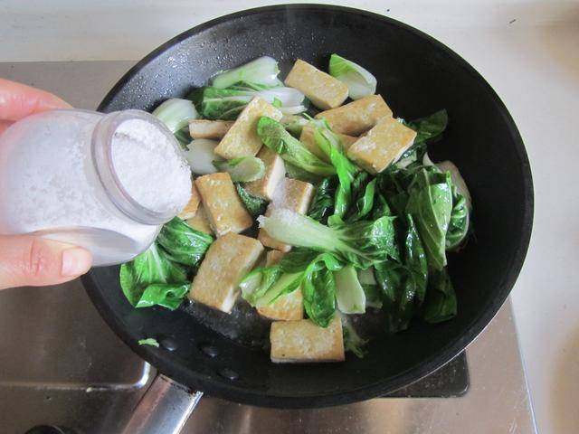 4. 加入准备好的豆腐块放进锅中翻炒几下, 加入少许盐调味,翻炒均匀即可。