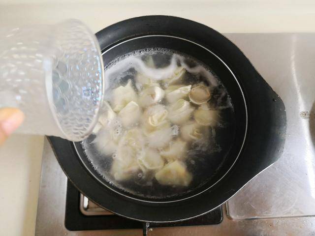5. 烧锅开水,将制作好的”虾仁馄饨“放进锅中去煮,大火煮开后加入少许水继续煮,煮至馄饨全部浮起来后再继续煮上1分钟, 捞出放入高汤碗中,再撒上少许葱花即可。
