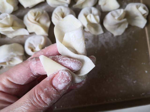 3. 将馄饨皮向上折叠两下,再将它们对向折叠按压紧,这样”虾仁馄饨“就制作好了;