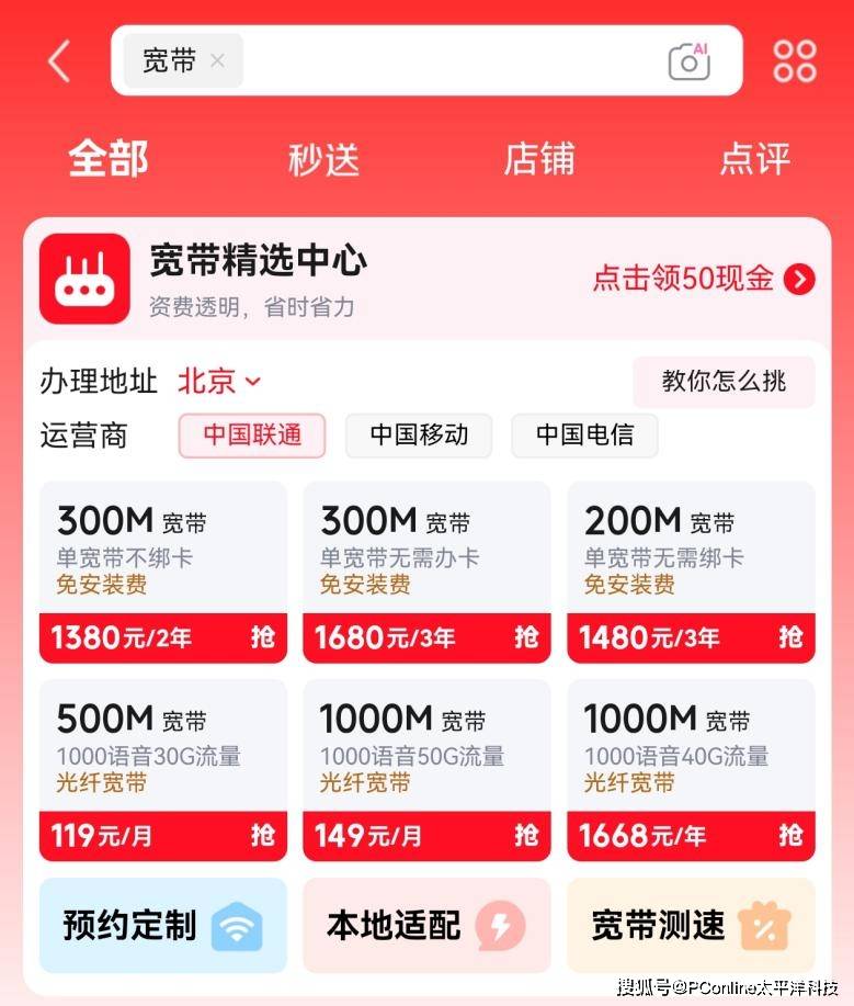 此外,消费者在宽带精选中心还可以办理宽带,价格低至1元/天起。以北京为例,中国联通300M宽带到手价1680元/3年;中国移动300M宽带到手价504元/1年;中国电信1000M宽带到手价999元/年(合约期12年)。