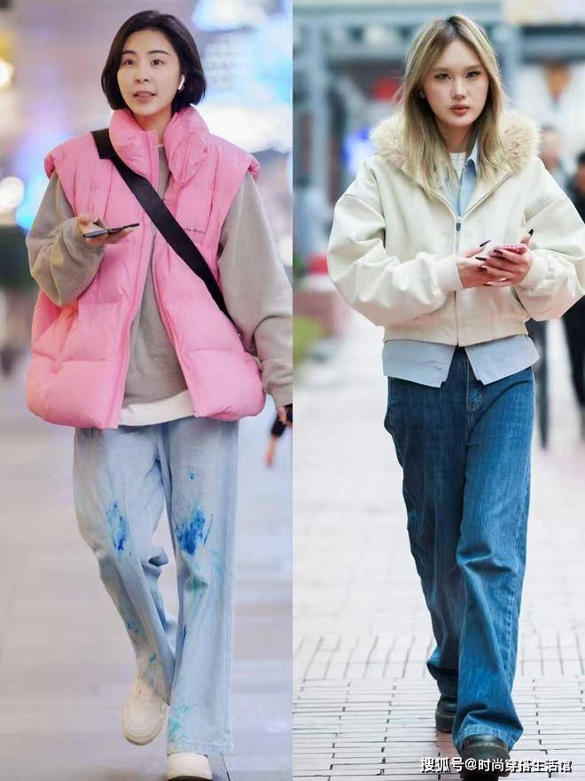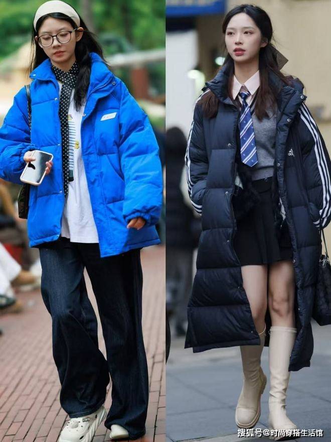 ②羽绒服和下装形成松紧结合,优化身材比例