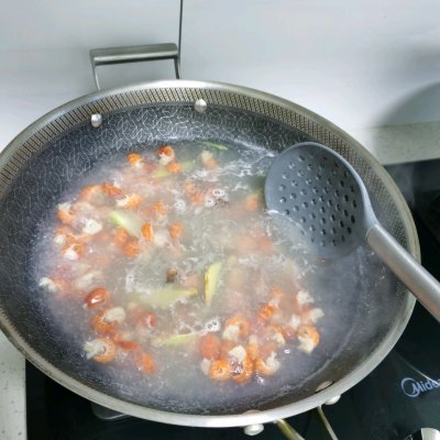 1、冷水下锅,加入葱、姜、八角,煮3-5分钟。这样可以去除龙虾尾的腥味。煮好后,把葱姜八角捞出来,一会儿爆锅用。