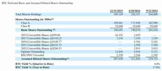 今年,微策略为其比特币策略引入了一个新的关键绩效指标——「比特币收益率」。这个指标是微策略持有的比特币数量与其稀释后流通股数量的比率。微策略认为,这个KPI能帮助投资者更好地理解和决定是否通过发行额外普通股或可转换为普通股的工具来购买比特币。在上次财报中,微策略设定了未来三年以每年4%至8%增长的目标。