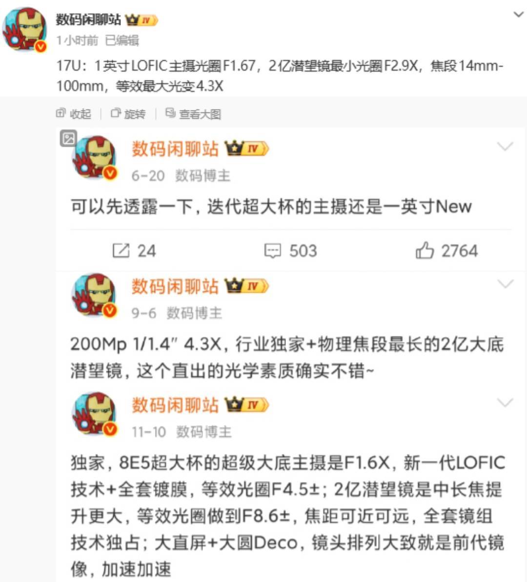 在回复评论区关于超广角为 JN5 的传闻时,博主回应称“还是超广角使用率太低了,用它的体积换主摄和长焦升级”。