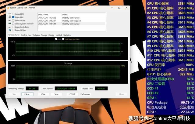 使用AIDA 64系统稳定性测试Stress FPU进行CPU单烤测试,30分钟后,功耗100W左右,CPU二极管温度88度,CCD1温度87度,CCD2温度84度,CCD1频率与CCD2频率都在3.6GHz左右。
