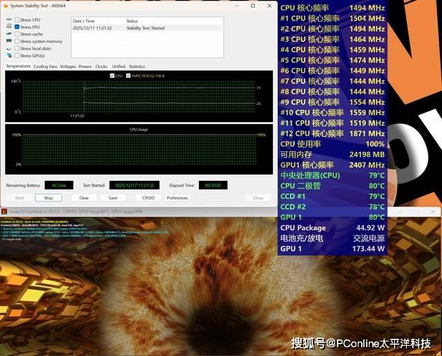 FurMark 1920*1080 8xMSAA+AIDA 64系统稳定性测试Stress FPU,双烤30分钟后,CPU功耗45W,CPU二极管温度80度,CCD1温度79度,CCD2温度78度,CCD1频率与CCD2频率1.45GHz~1.5GHz;GPU功耗175W左右、频率2400MHz左右,温度80度。