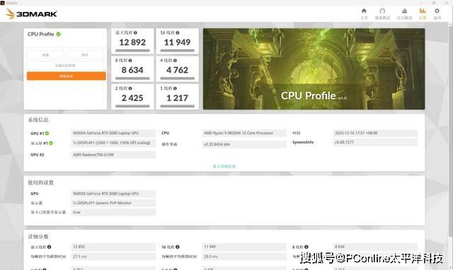 在3DMark Profile中,单线程性能1217,最大线程性能12892。
