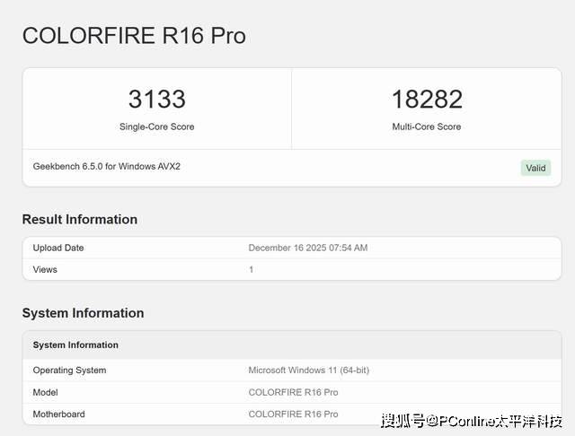 在Geekbench 6中,单核性能3133,多核性能18282;