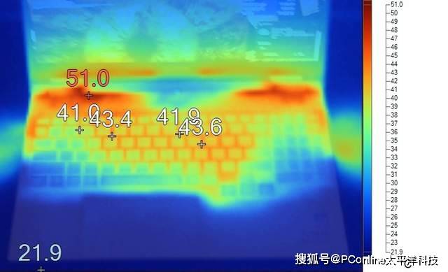 在环境温度大致23度的情况下,双烤30分钟后,表面温度最高处位于转轴出风口处,温度51度;键盘区域温度最高处位于中间偏右,温度43.6度。