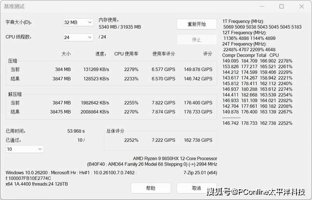 在更看重缓存、多核能力、内存性能表现的解压缩和压缩场景下,在7-Zip BenchMark中,选择32MB字典大小,压缩评分为146.742GIPS、解压缩评分178,733GIPS,总评分162.738GIPS。