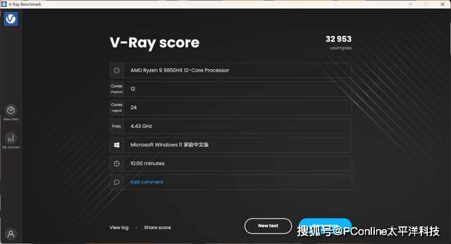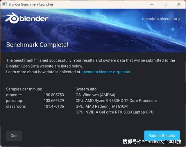 同时我们也测试了在渲染软件V-Ray BenchMark和Blender BenchMark中的性能表现,在选择使用CPU纯物理运算的情况下,在V-Ray BenchMark中性能得分:32953vsamples。