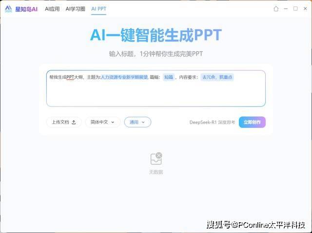 AIPPT则是可以一键生成PPT,通过一段文字描述便可以自动完成从大纲至完整PPT导出的全流程。比如在这里我先给出一段描述,AIPPT便可以先行生成符合该描述的大纲,大纲可以进行自行修改。
