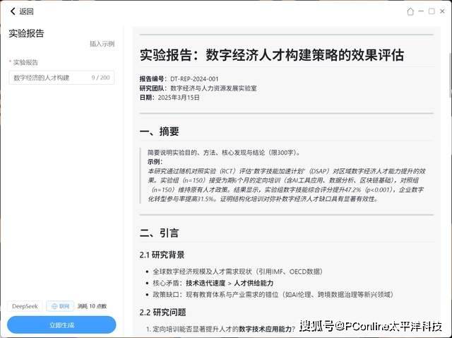 以及非常多的场景化AI细分功能,比如我这里使用“实验报告”功能让AI生成了一份有关“数字经济的人才构建”的实验报告。