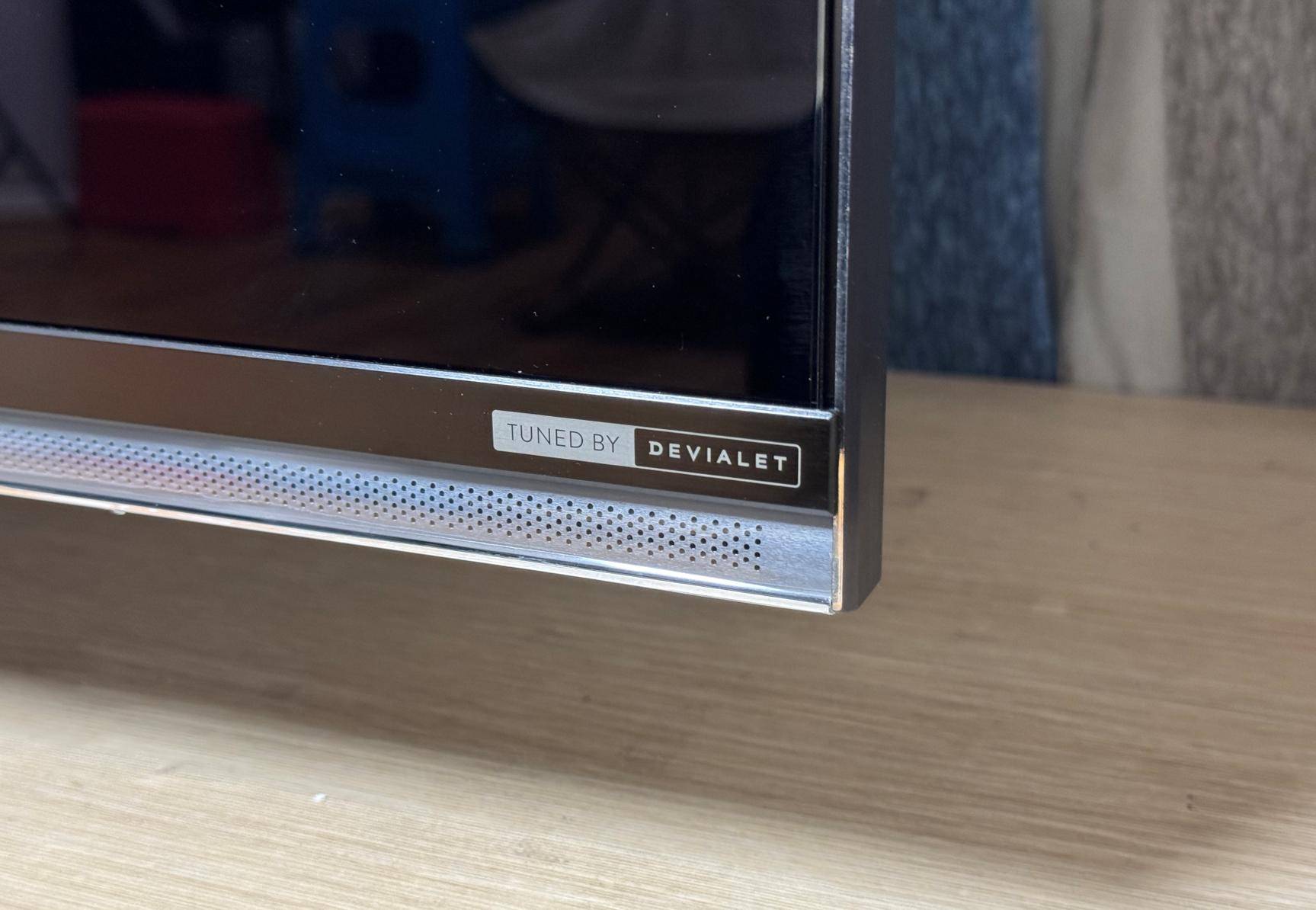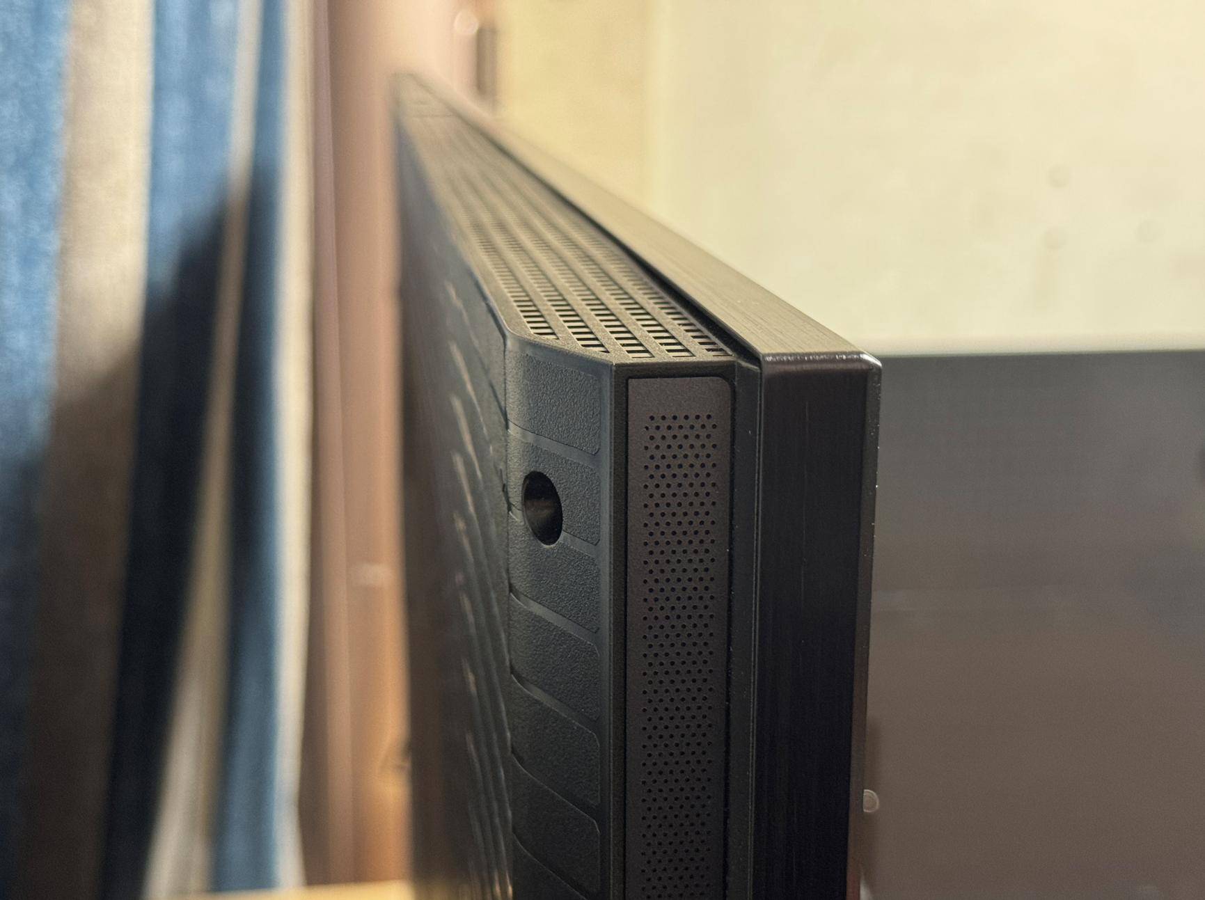 E8S Pro机身下方的左右,分别有RGB-Mini LED以及帝瓦雷的金属标识。机身背部也采用了纯平设计,拥有独立的低音单元,我们测试时用的是金属中置底座。在接口部分,E8S Pro采用了四个HDMI 2.1、一个USB 3.0、一个USB 2.0、百兆网口、有线电视接口、同轴输出、AV复合接口的组合,外侧还有一个USB 2.0的接口。