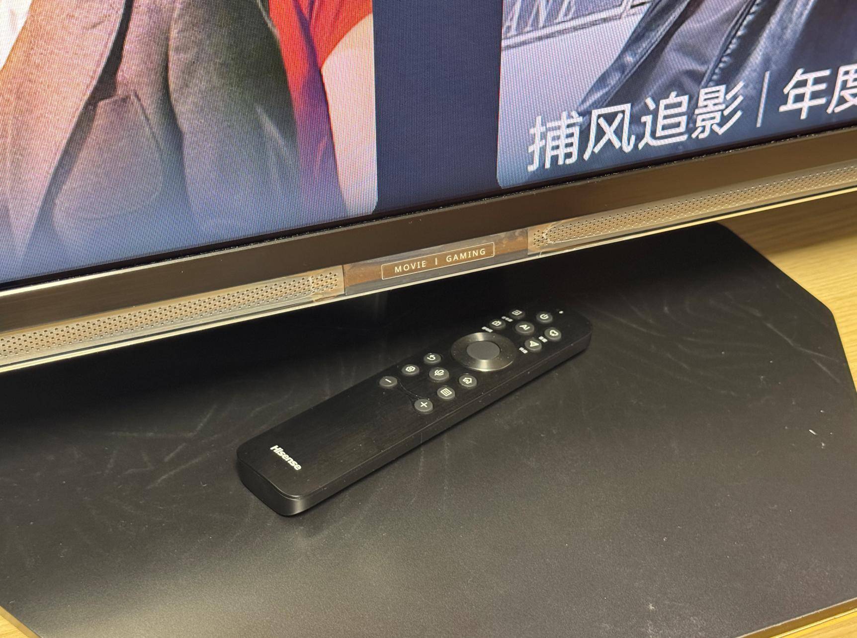 在E8S Pro底部中间,海信单独做了一个MOVIE | GAMING的标识,诠释了E8S Pro的定位,这显然是为影音用户和游戏玩家准备的一款高端产品。需要再次说明的是,我们手头的E8S Pro和零售的版本在配置上有一些区别,包括遥控器,大家可以通过我们之前U7S Pro的测试,了解海信“灵指遥控”功能以及更多外形上的特色。