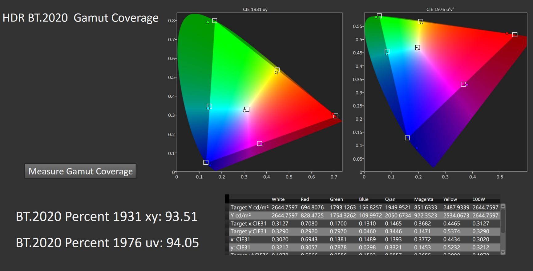 在色域部分,E8S Pro作为RGB-Mini LED电视当然非常出色,DCI-P3的色域覆盖率接近100%,而大众比较关注的BT2020色域覆盖率则超过了94%,这是目前我们测试到色域最高的液晶电视,充分体现了RGB-Mini LED的优势。