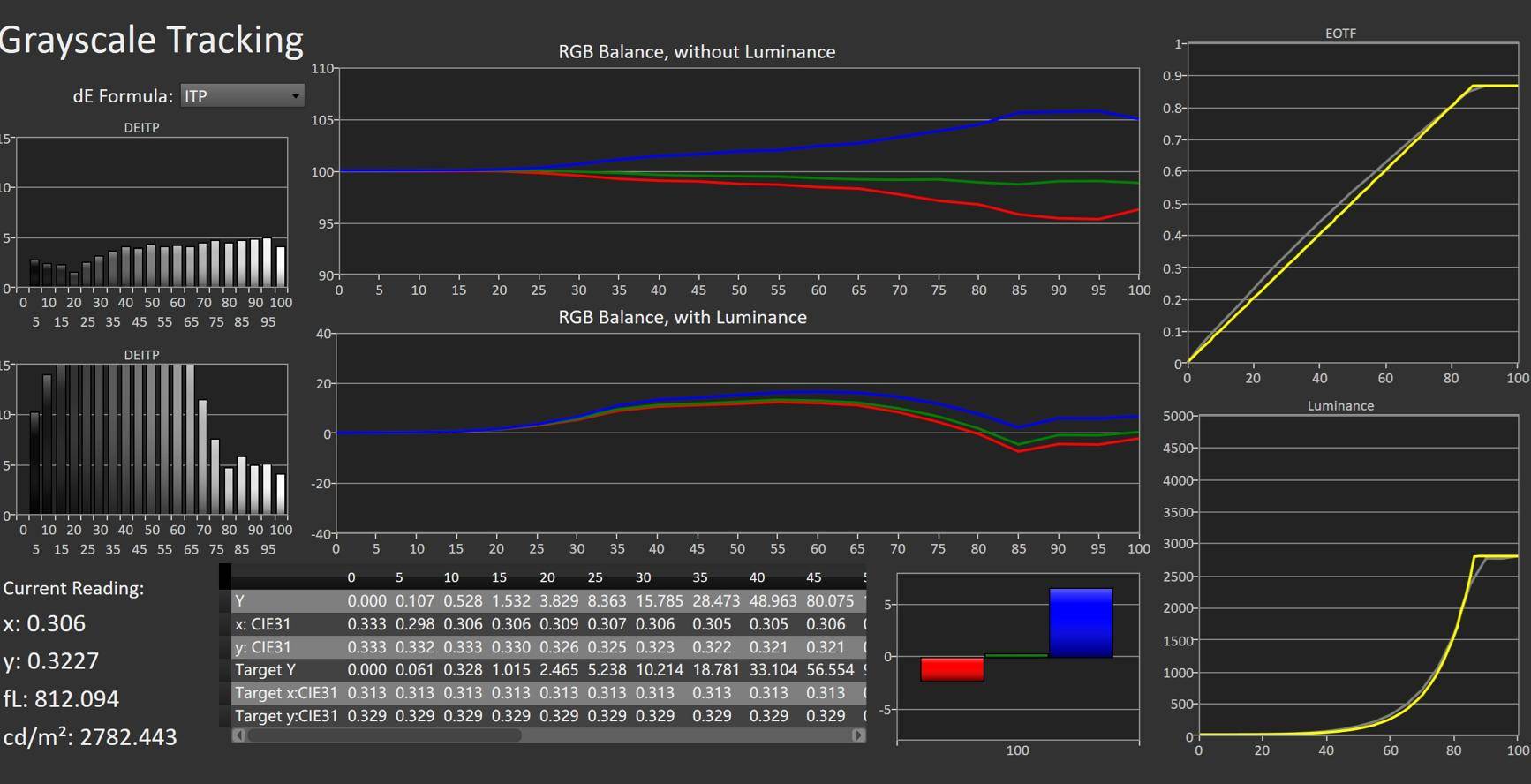 在HDR EOTF上,E8S Pro的表现不错,在正常和偏亮部分会比信号亮度高一些,但一头一尾的暗部和高亮度上则表现正常,这不会对用户观看电视造成什么负面影响。同时,在接近峰值亮度的时候,E8S Pro会有一个滚降来维持高光细节。