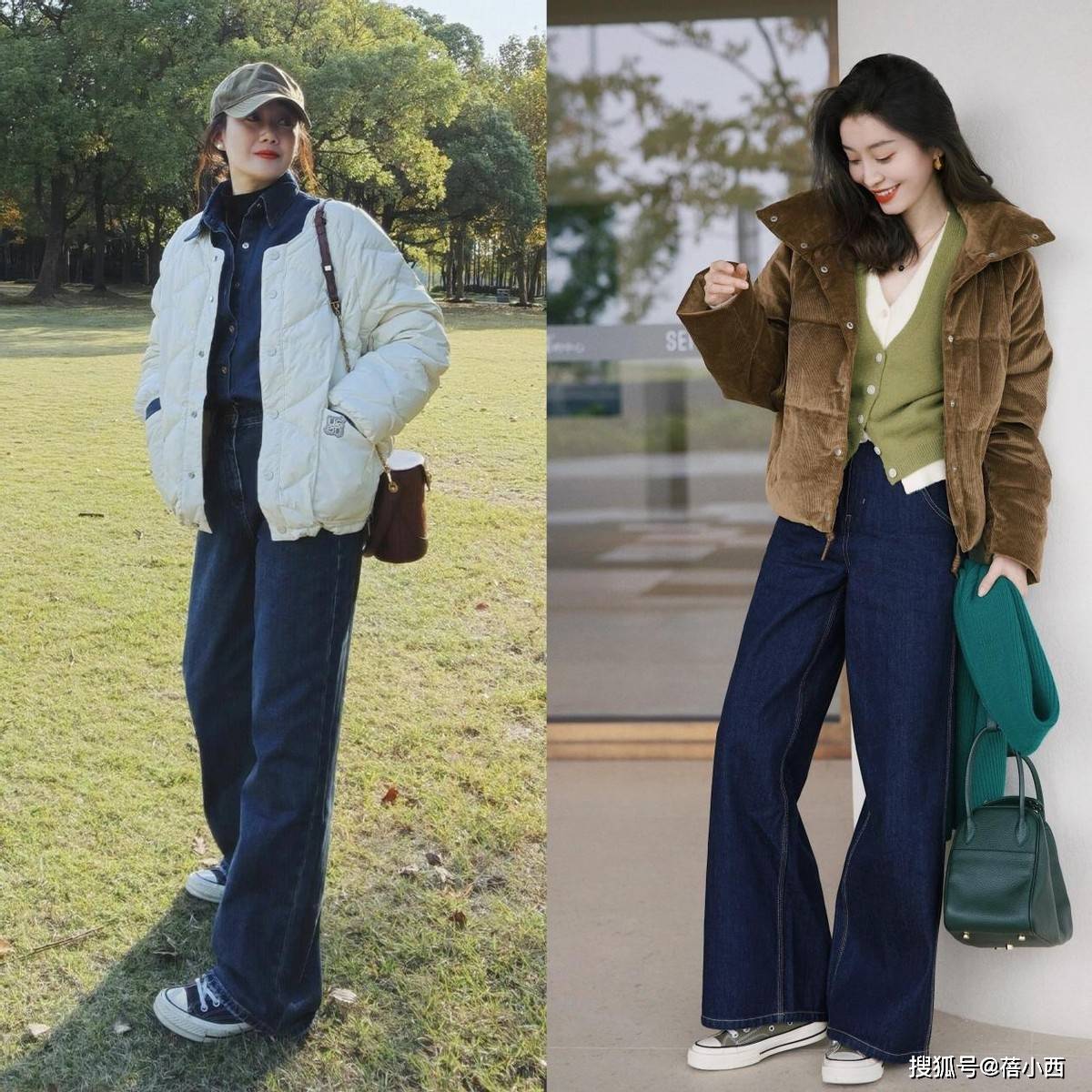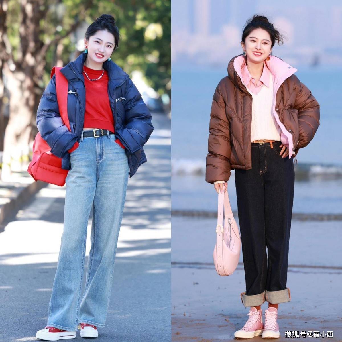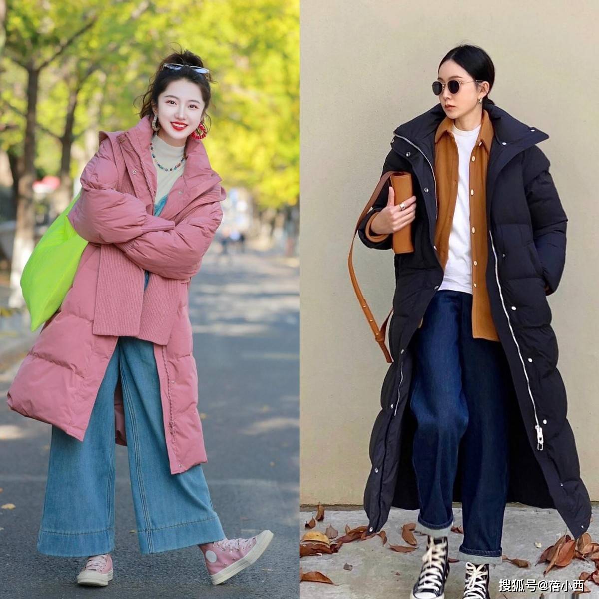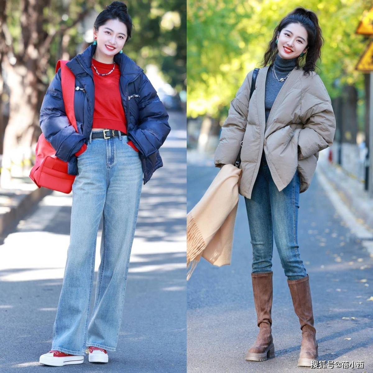 长款羽绒服配牛仔裤时,脚下直接踩一双高帮的帆布鞋,裤脚挽起两圈凸显脚踝曲线,可以瞬间拉长腿长,小个子也能穿出利落感,不管是通勤上班还是周末逛街,都舒服又好看。