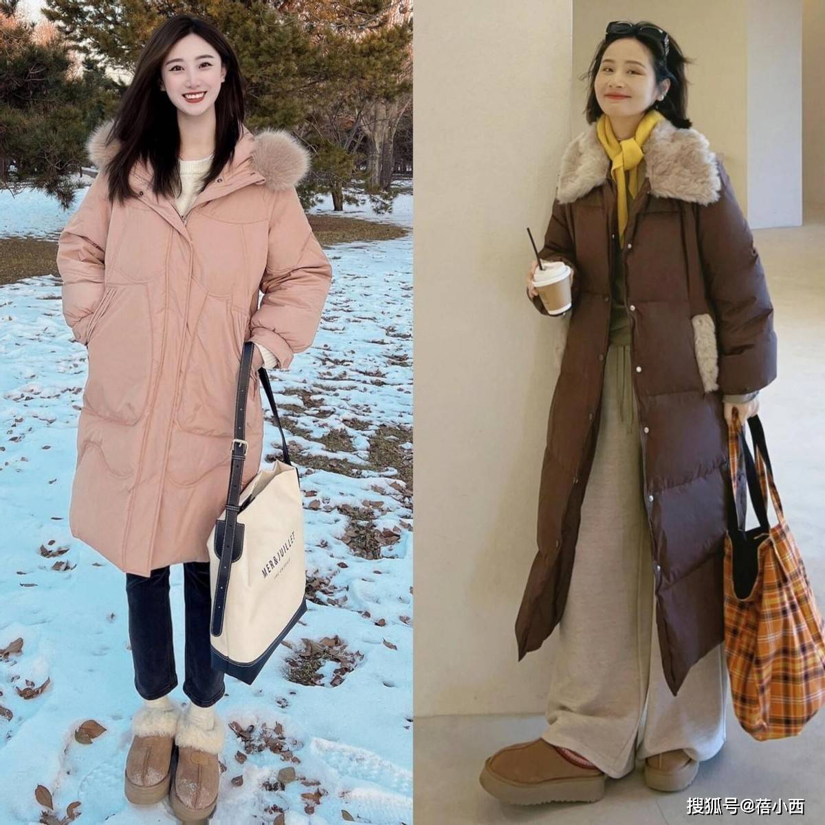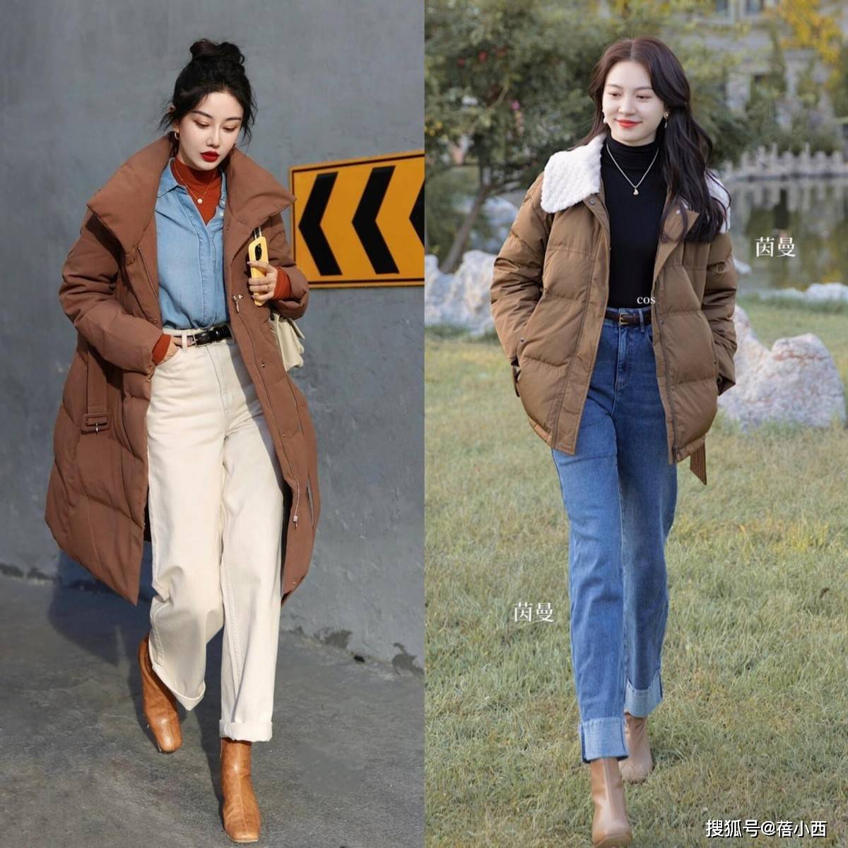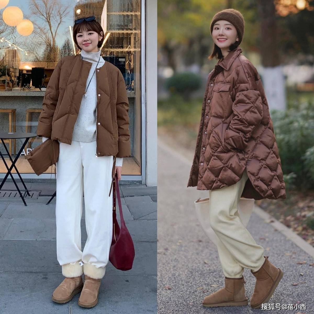 中长款羽绒服也很百搭,我们可以在下半身搭配一双直筒裤或者是阔腿裤配雪地靴,颜色别太艳丽,选卡其色、深棕色这种低饱和色,遵循“鞋靴和下装同色”的原则,看起来会更加利落显瘦。