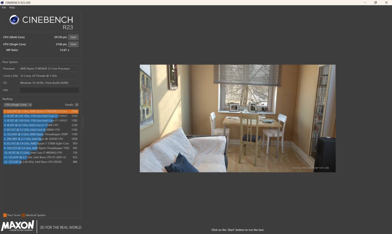 在CINEBENCH R23中,单核性能2100pts,多核性能29130pts;