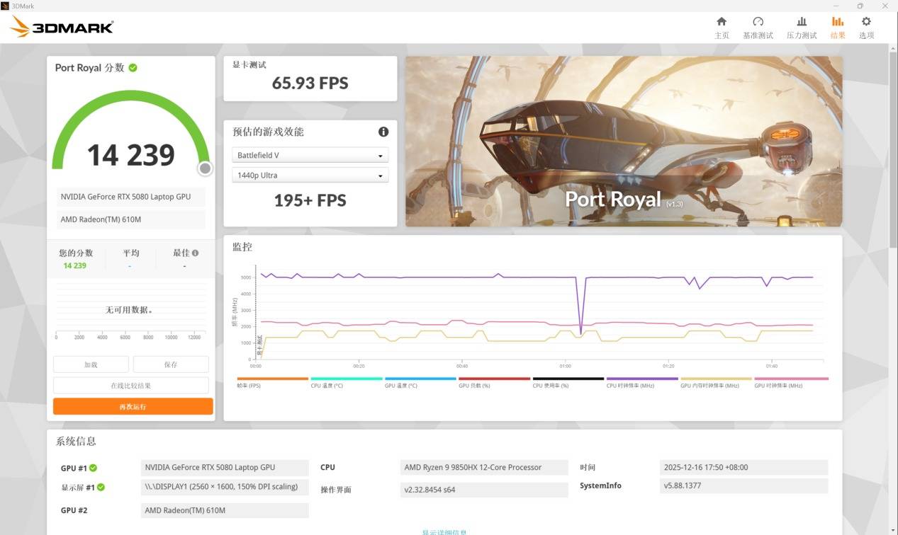 GPU的性能自不必担心,其图形性能表现符合满血功耗下RTX 5080 Laptop GPU的水平。