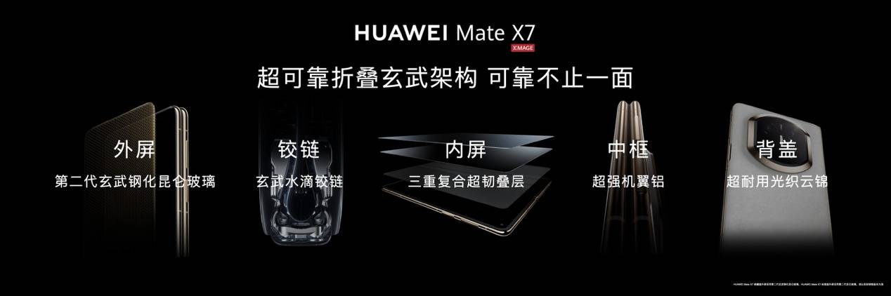 华为Mate X7实现软硬协同与全维可靠的双重突破,以领先折叠架构设计搭配流畅的鸿蒙操作系统6及全新鸿蒙生态,充分释放折叠机大屏性能,通过软硬件深度协同让整机卓越性能提升42%;同时配备 3550m㎡超大 VC 石墨烯跨轴散热系统,确保高性能持续稳定输出,内置的5600mAh大电池在户外探索模式极限续航配置下可达 10 天,再加上28根分布式天线与智能调度技术,实现5A极速体验,快人一步。在可靠性方面,华为Mate X7机身架构完成革命性突破,搭载超可靠折叠玄武架构,凭借第二代玄武钢化昆仑玻璃外屏、玄武水滴铰链、三重复合超韧叠层内屏、超强机翼铝中框、超耐用光织云锦背盖五大核心部件的协同升级,构筑起全方位超强防护体系,不仅为用户带来稳稳的安心体验,更实现了折叠屏轻薄便携与坚固可靠的完美兼顾。