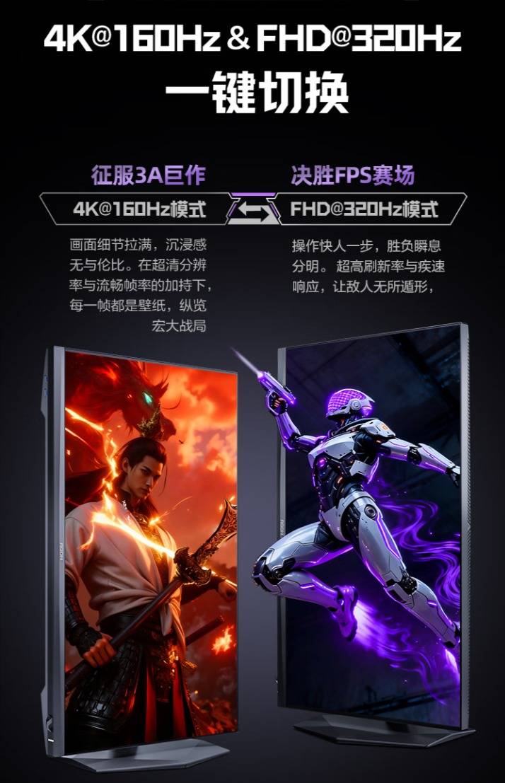 在AI软实力的背后,当然还有极强的物理规格。AG277UX搭载的FastIPS面板,支持双模显示技术。这使得玩家可以根据游戏需求,一键在4K160Hz的细腻画质与FHD320Hz的极限流畅间自由切换。这种一机两用的设计,完美解决了3A玩家对画质的渴求与电竞玩家对帧数的执着。
