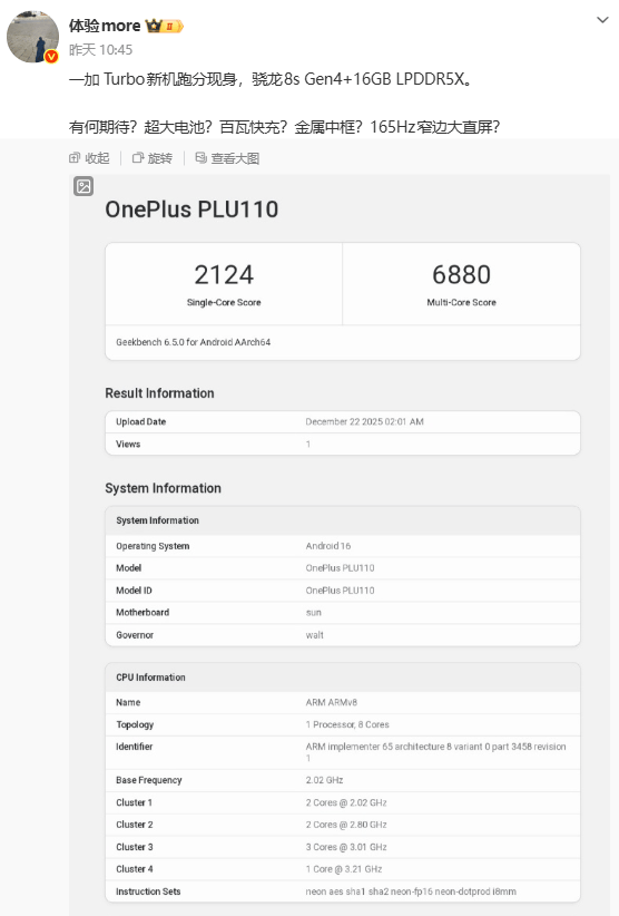 此前,另一博主“体验 more”也曾在社交平台曝光一款型号为一加 PLU110 的新机跑分信息,并称其为一加 Turbo 新机。根据 Geekbench 数据显示,该机型搭载骁龙 8s Gen4 处理器与 16GB LPDDR5X ,单核跑分 2124,多核成绩为 6880。