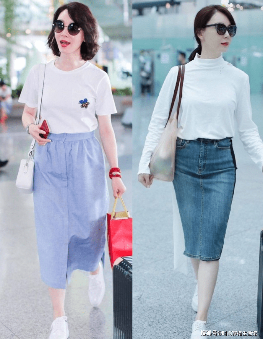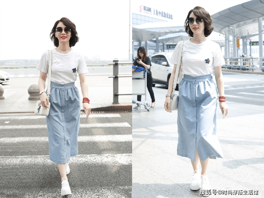 就像下身选择蓝色半身裙,长款的版型很有包容性,而且整体白蓝相间的色彩,清新又带着治愈系,重点是很显年轻。
