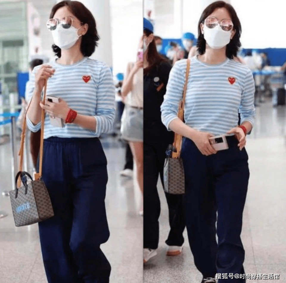 在选择T恤的时候,若是已经穿腻了经典的纯色系T恤,那么和陈数同款的条纹T恤,同样是非常不错的搭配选择。为了稍微“压制”一下活泼跳跃风格的上衣,陈数搭配了一条深蓝色的宽松款卫裤作为下装。
