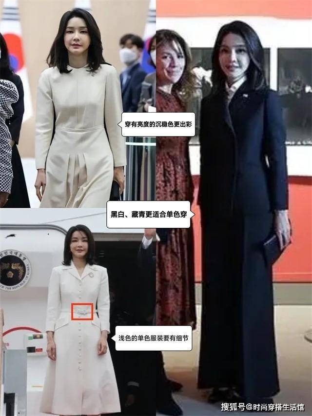 在韩国第一夫人金建希穿衣准则中,大多数都是以纯色为主,而且还是比较经典百搭的无色调,黑白灰就是最常见的。就好比她当天出席韩国总统上任典礼时,就穿了一身白色西装裙,白色代表着高雅、大方、端庄得体的气质,在正式场合与日常生活中都很适用。