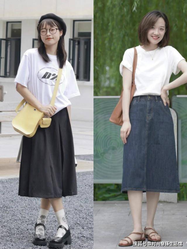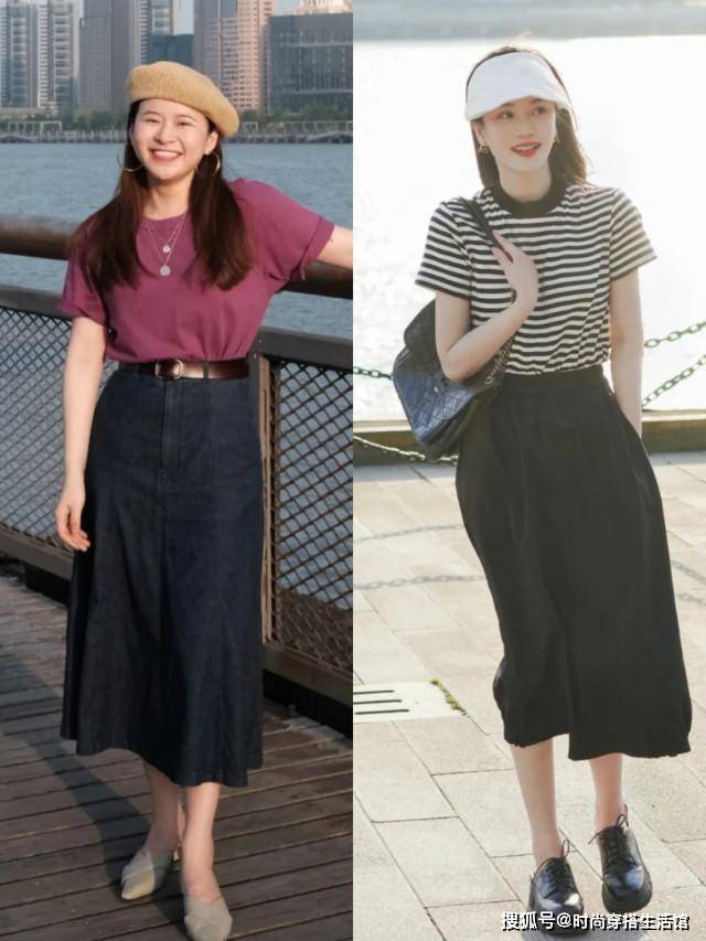 对于微胖型身材以及梨形身材的女性来说,A字裙与T恤的搭配无疑是最佳首选。A字的裙摆立体感极强,对胯宽以及腿上的赘肉都有着很好地遮盖效果。比较减龄一些的穿法,就是选择牛仔A字裙搭配T恤,增添街头风的属性。