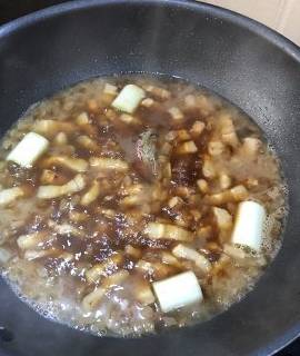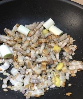 3.洋葱和五花肉炒焦,扔葱段和姜片继续炒炒香