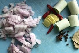 1.洋葱切碎大葱切段姜切片辣椒对半切。