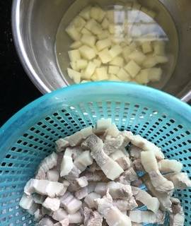 2.土豆胡萝卜切小块,五花肉切细条焯水洗净血沫。
