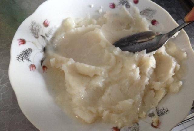 第二步:时间到了,取出山药,稍凉。山药放凉,去皮,放在案板上,用刀把废料磨成泥。山药捣碎后,放入碗中备用。处理山药时,需要将山药磨成光滑无颗粒的山药浆。