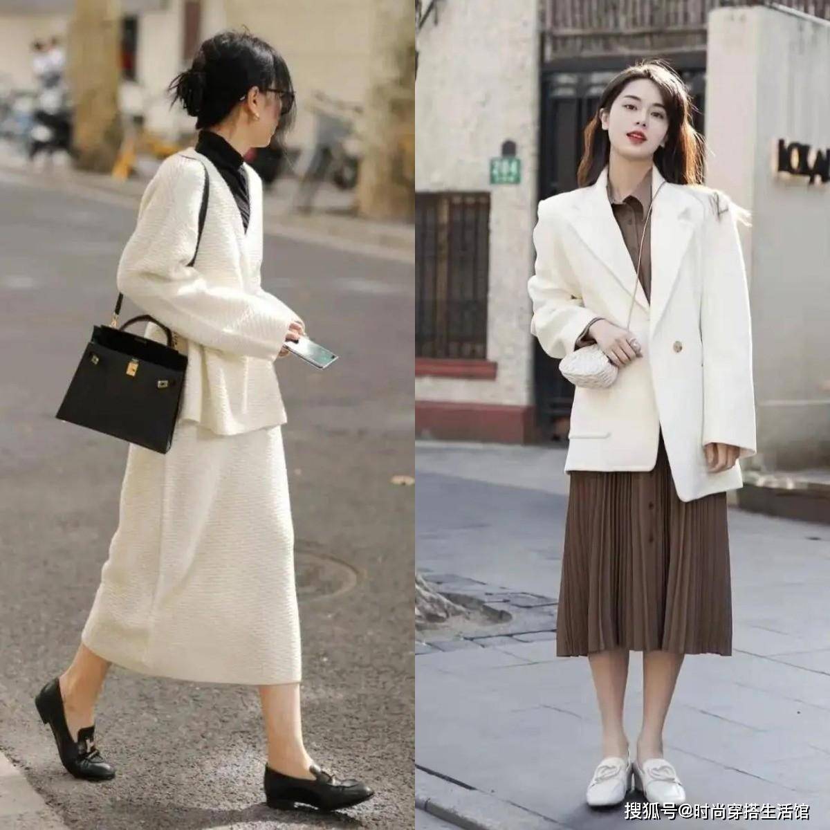 春夏适合穿白色系乐福鞋,借助温柔干净的白色系来提升造型高级感,搭配蓝色牛仔裤或者同色系九分裤,简约高级还不失熟龄女人味。