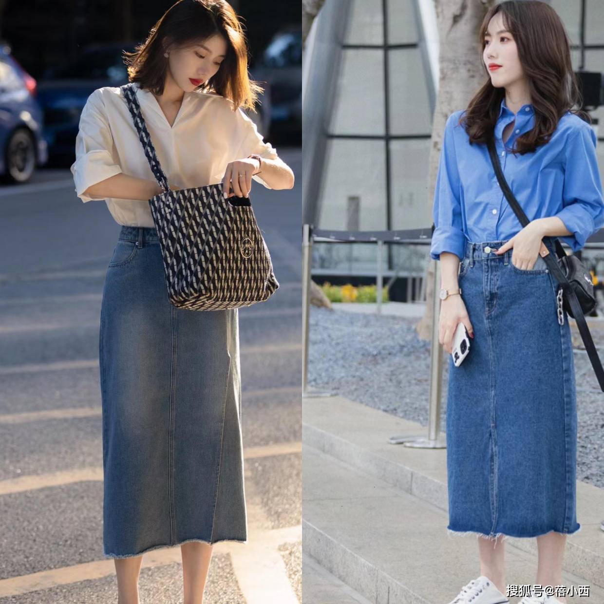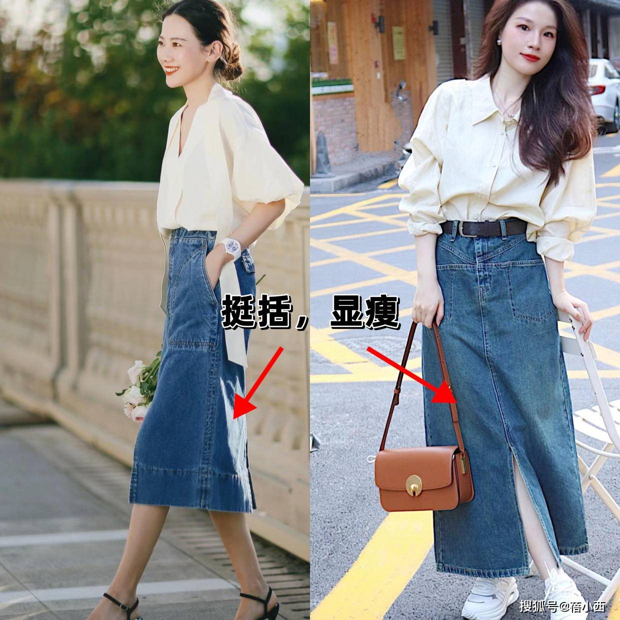 说起半身裙的款式,牛仔半身裙肯定是春夏首选,牛仔材质硬挺不厚重,在这个季节搭配就挺合适的,并且大多数牛仔裙的轮廓感强,修饰腿型和身材比例的效果好,很适合梨形胯宽腿粗的女人。