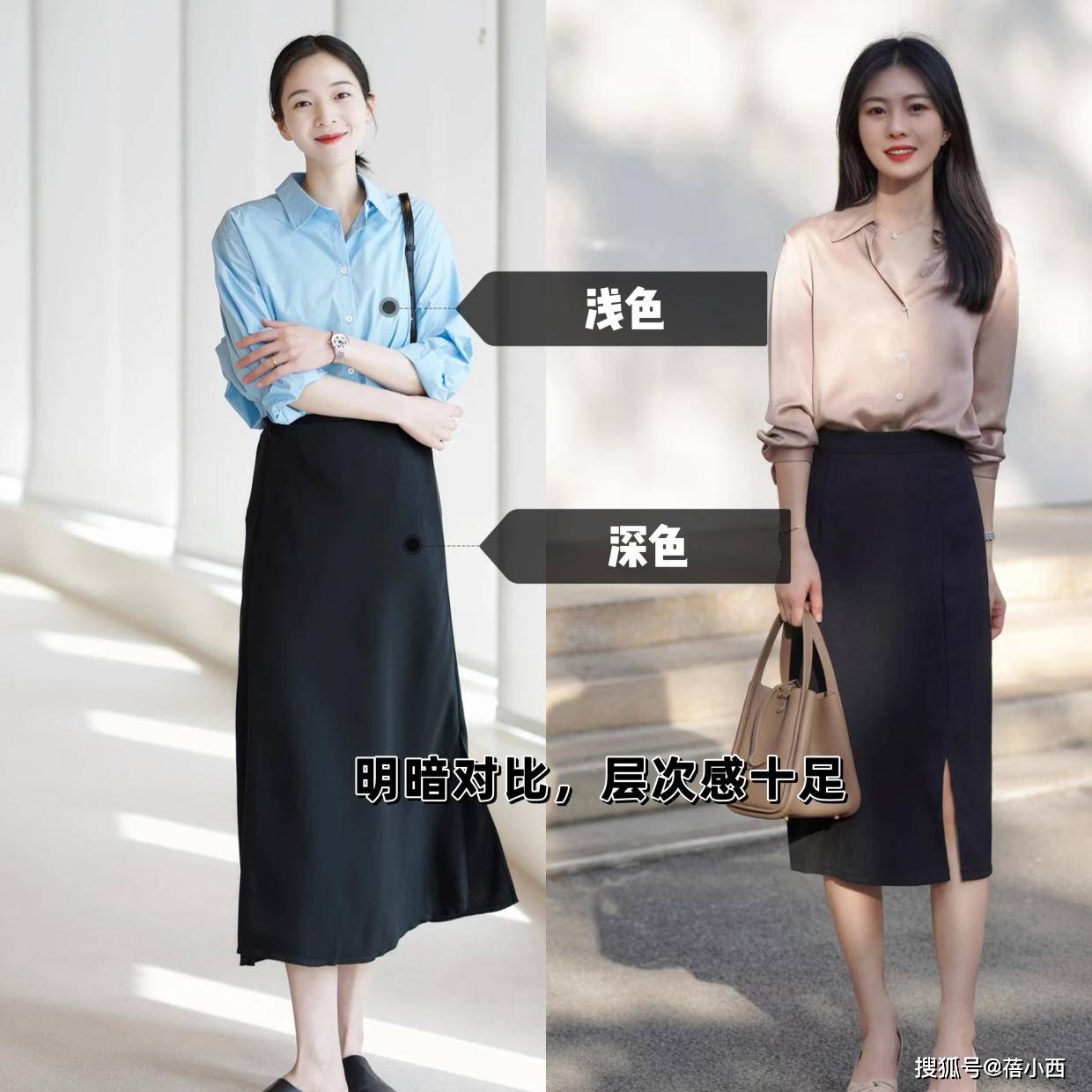 衬衫和半身裙的搭配风格非常多样,所以我们不能随便搭配,重点在于根据场合调节穿衣风格,例如日常搭配牛仔裙和衬衫,风格偏休闲,通勤用小黑裙搭配衬衫,优雅知性,更具有职业干练气质。