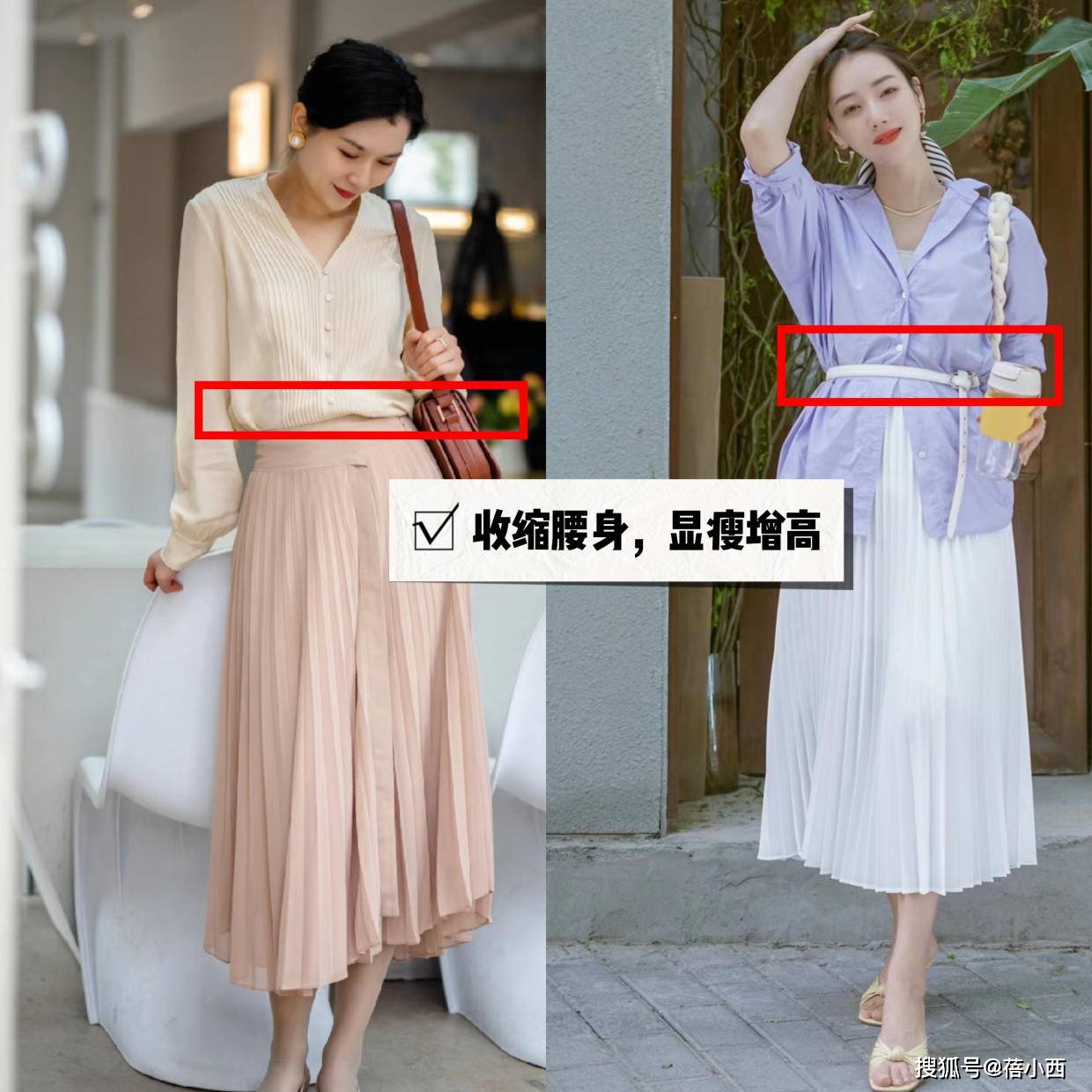 想要增高显瘦,最关键的一点就是改变我们的腰身,改善我们搭配下半身比例,因此穿衬衫搭配半身裙要重点体现高腰线,可以借助短衬衫塞进高腰裙的搭配技巧,调节你的身材,使得比例看起来更好。