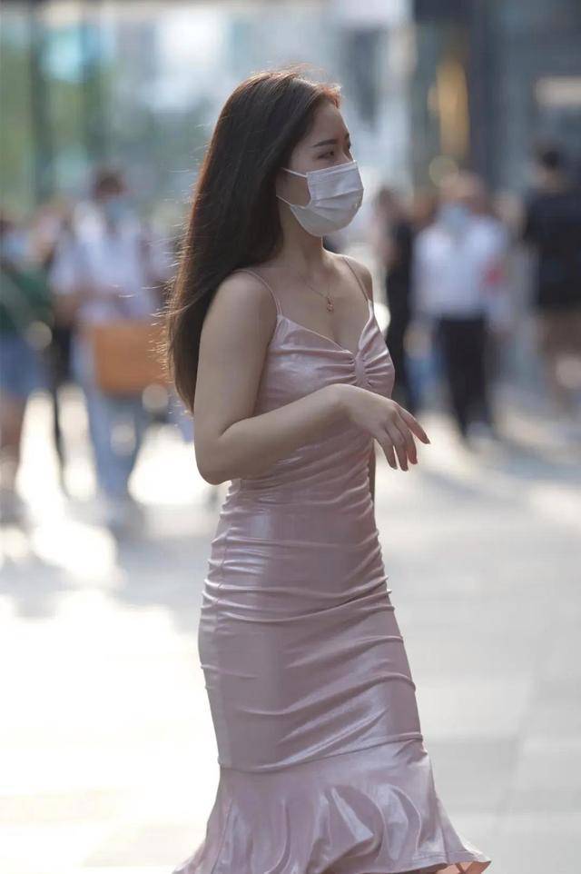 她还披着一头顺滑的长发,让整个人看起来更加亮眼自信。手上拎着一个粉色小包,与裙子和高跟鞋相呼应,完美地点缀了整个造型。总而言之,这样简约又时尚的穿搭凸显出这位美女的青春、活力和自信。整个人看起来充满了活力和独特魅力,吸引了众多路人的目光。