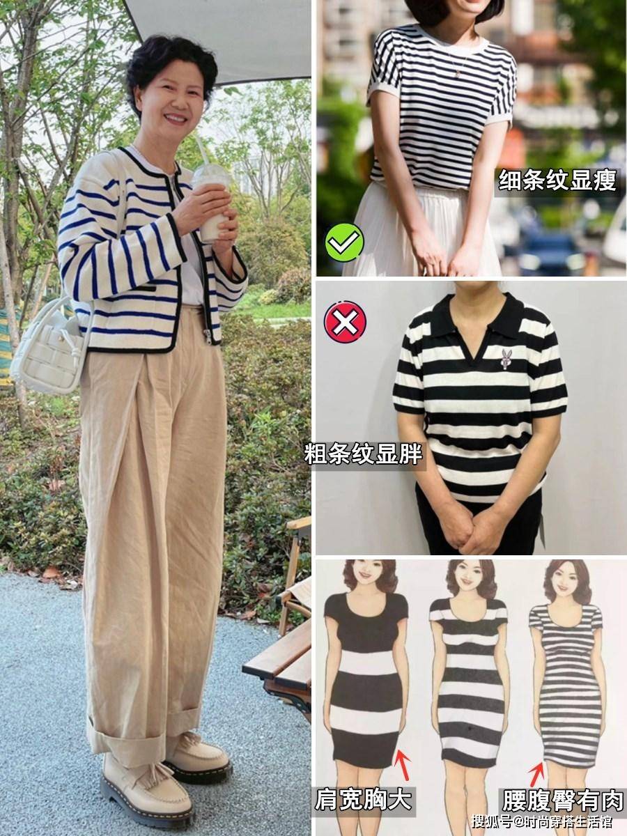 就算因为胯宽腿粗等问题导致条纹的变形,也不会太过明显,但粗条纹却截然相反,粗大的条纹设计会导致身材横向扩展,显得更加臃肿肥胖。