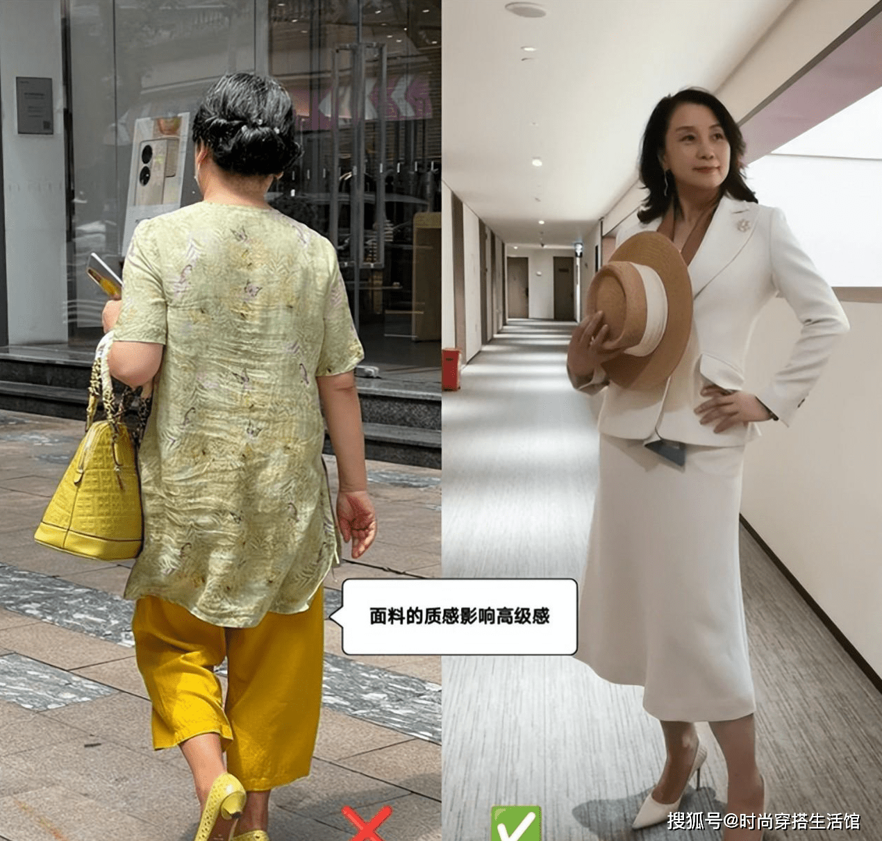 想要凸显中年女性的气质,就需要提升服饰的质感,在选款时,首先就要避免面料过于廉价的款式,太廉价的服装穿就容易起褶皱、版型软塌不立挺、容易掉色,在视觉上会给人一种廉价、掉档次的感觉,会拉低自己的形象。