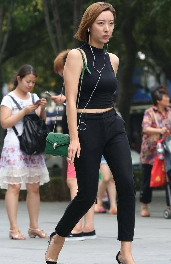 黑色九分裤不但可以修饰腰线,还可以修饰腿型,由于长度只到脚裸位置,搭配高跟鞋,清爽又舒适。上衣搭配一件露脐衫与裸露的脚裸遥相呼应,具有不错的穿搭层次感,特别具有小心机,比较适合25岁以上的职场女性。