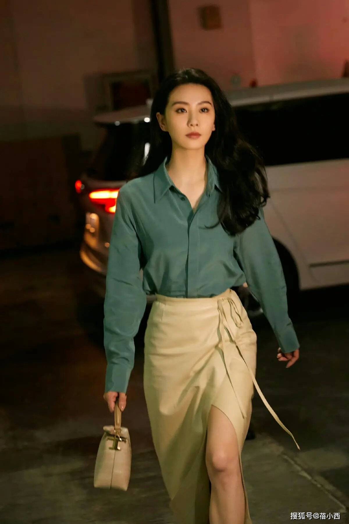 衬衫搭配上高腰的开叉半身裙看似简单,但实际上这样的穿搭是非常显身材的,尤其是刘诗诗所搭配的这条高腰的半身裙,侧边开叉修饰大长腿,很显瘦显身材。
