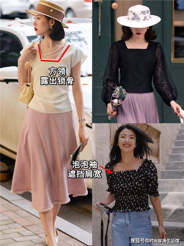 夏季的上衣很多,推荐小姐姐们试试今年流行的方领衫,方形的领口设计很好地展现出锁骨线条,如果你只是肩宽背厚,但是锁骨明显,搭配这样的上衣真的很有利于显瘦。