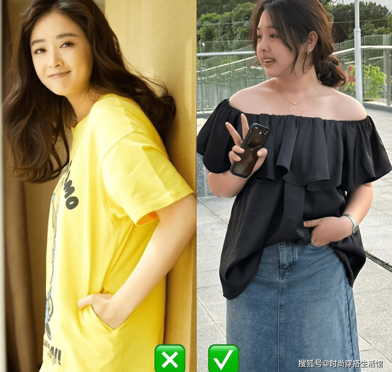 宽松的T恤或者是衬衫,这些单品的特点就在于对于上半身的遮挡性比较强,像我们的手臂我们的颈部还有我们的锁骨都会被遮挡住。这种宽松的上衣穿在身上就非常容易显得沉闷臃肿,反而有一定的露肤度的上衣会显得更清爽,也能视觉上显瘦。